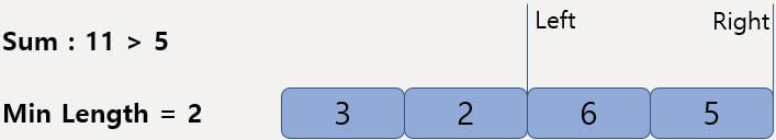 Right 변수를 옮긴 뒤 Sum이 5보다 크므로 Left 변수를 옮겨 구간 합을 더 작게 만든다.